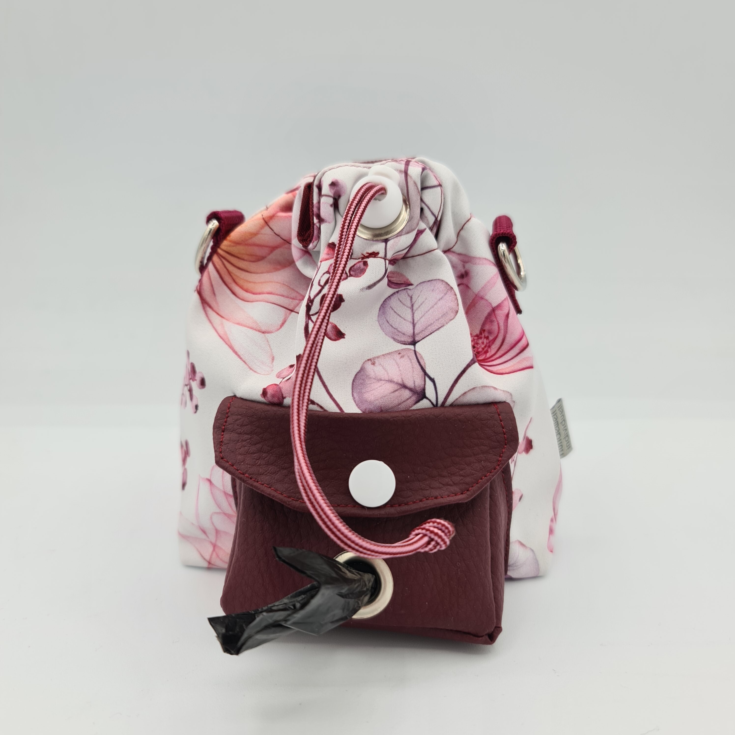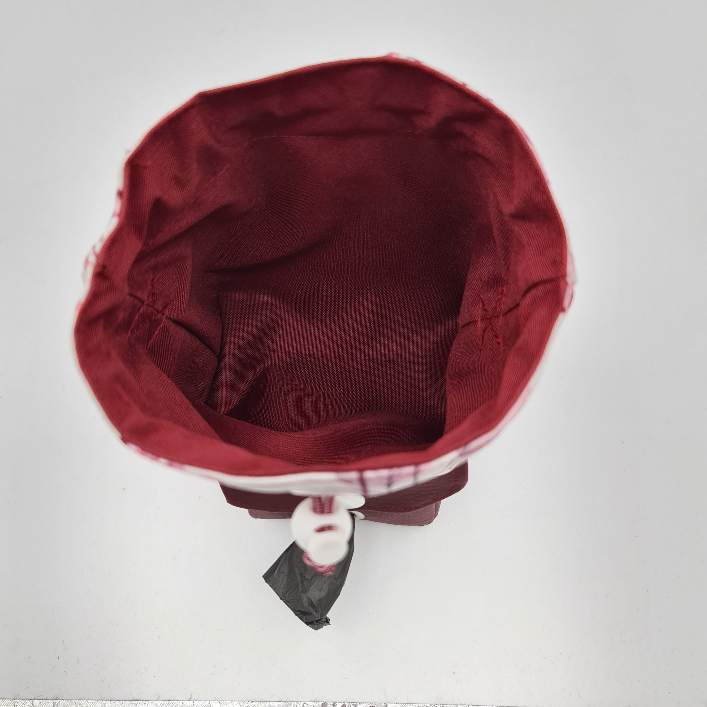 Der Beutel besteht außen aus wasserabweisendem Softshell, innen aus abwischbarem Outdoorstoff, der Kotbeutelspender ist aus Kunstleder.