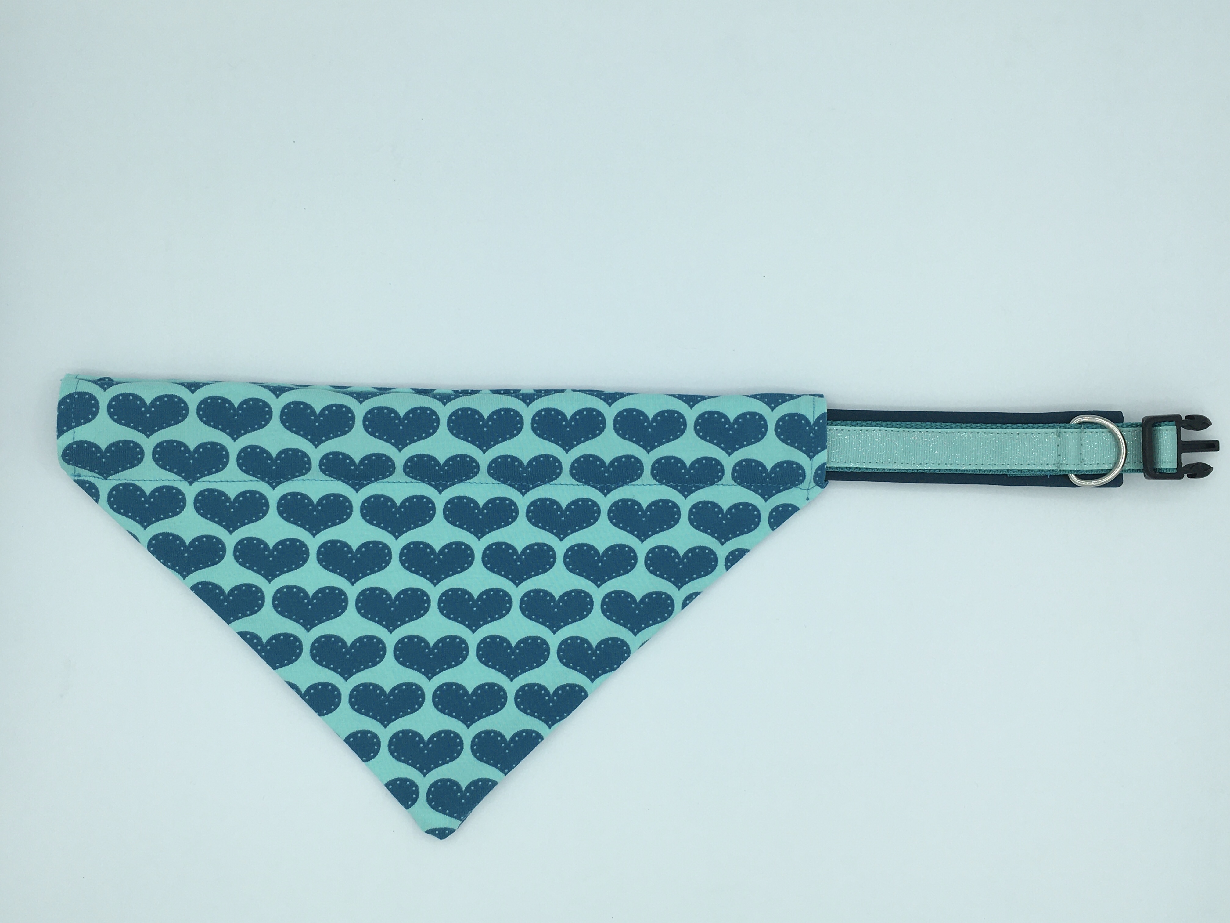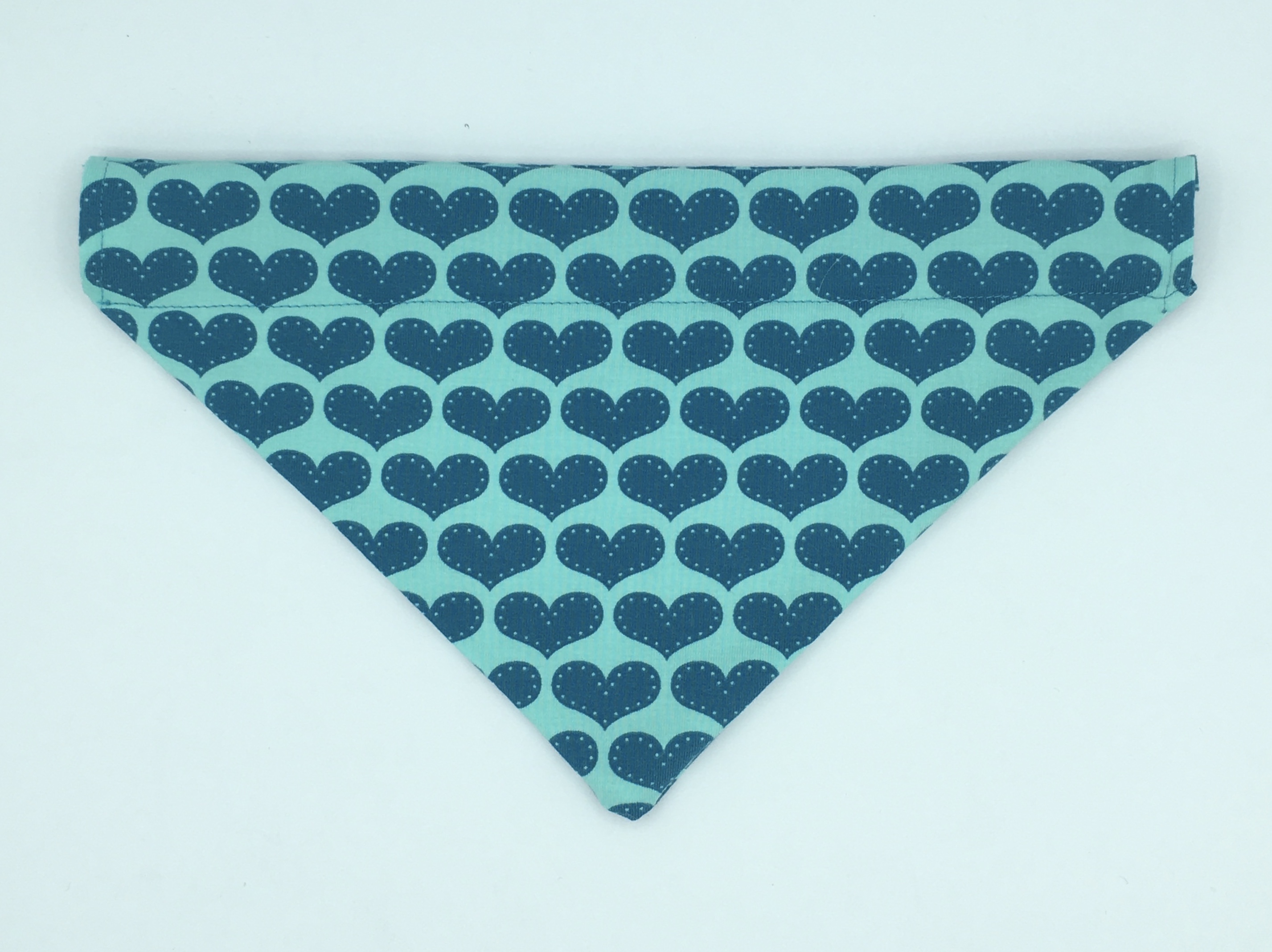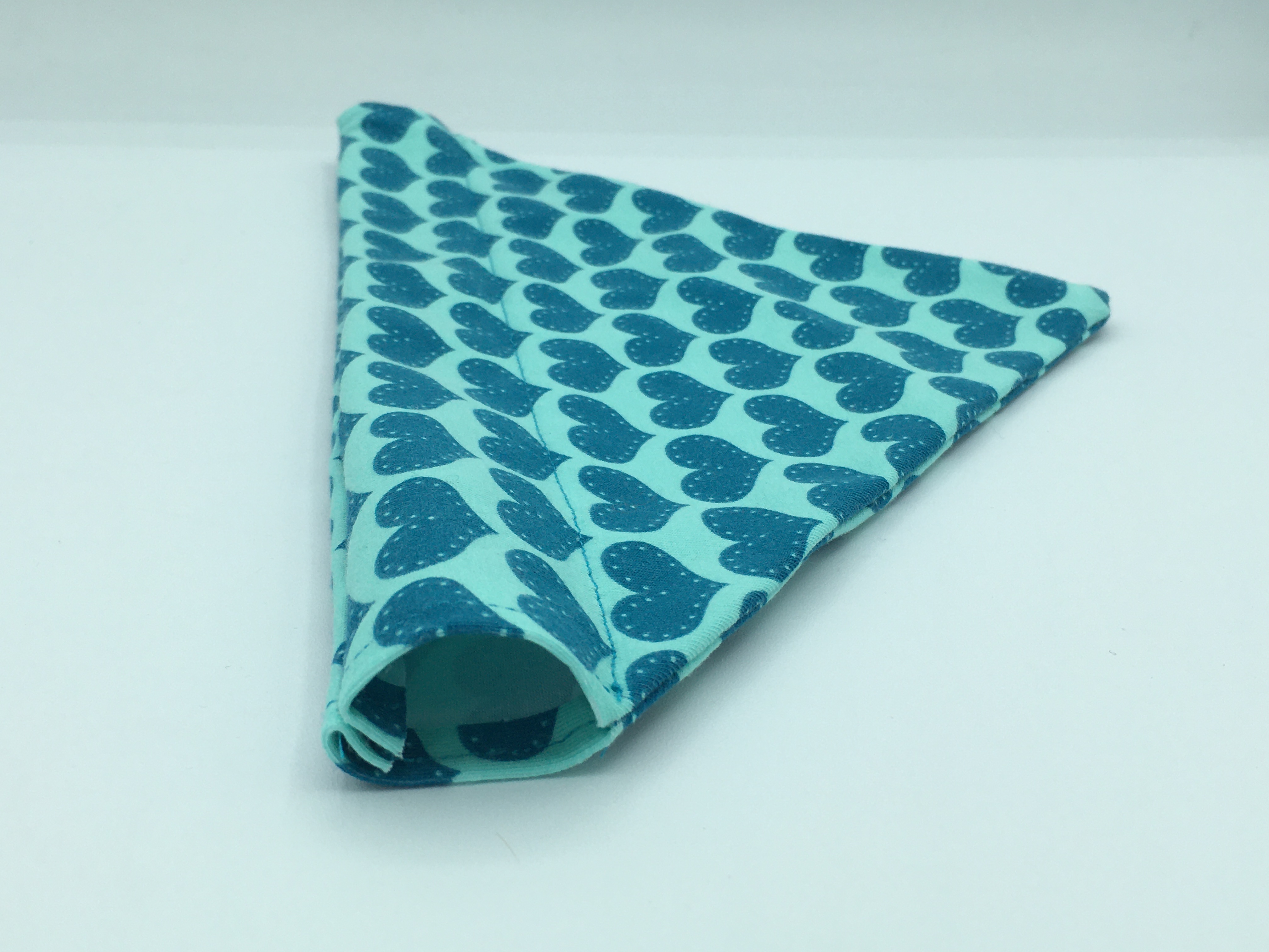Das Halstuch besteht aus glattem, weichem Baumwolljersey und kann bei 30 Grad in der Maschine gewaschen werden. Es ist türkis und hat petrolfarbene Herzen drauf.
