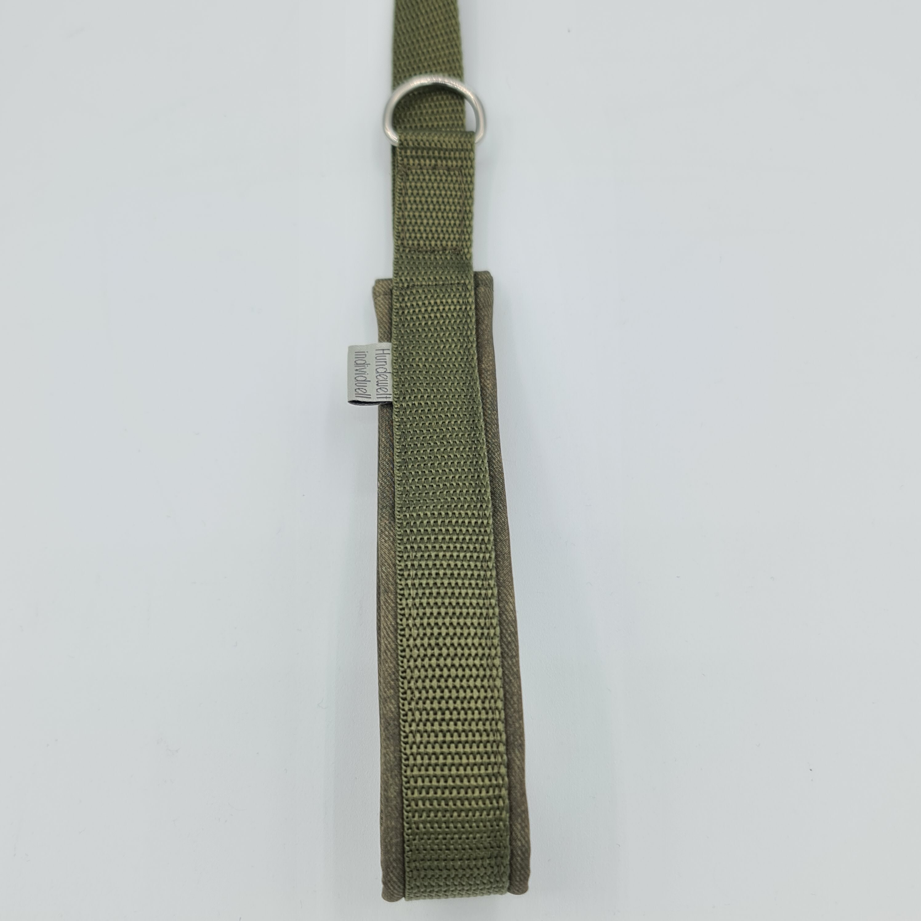 Sie ist Khaki Grün. Die komfortable Handschlaufe wird aus vintage Khakigrünem Softshell gefertigt.