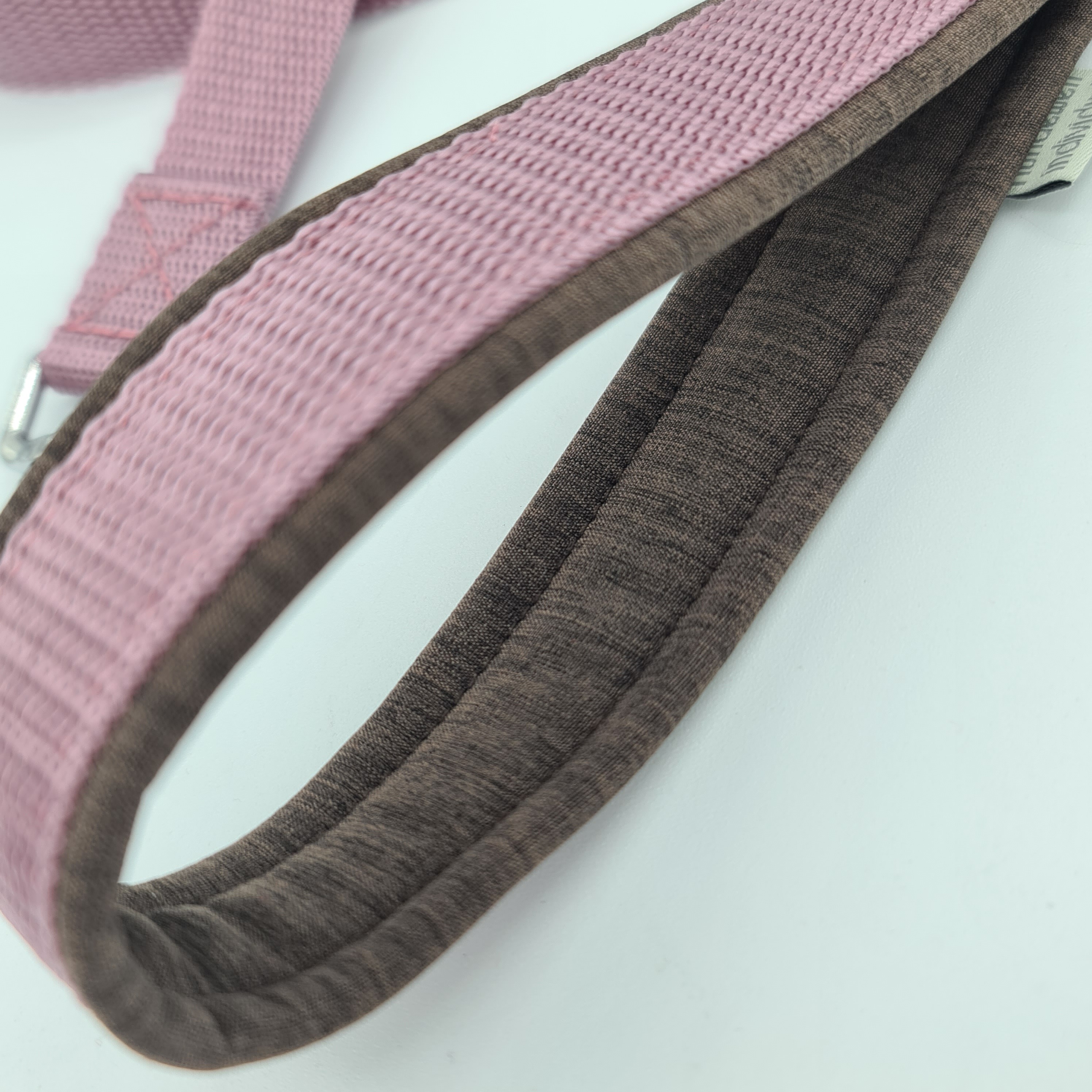 Sie ist in modernem Mauve Rosa. Die komfortable Handschlaufe wird aus braun melliertem Softshell gefertigt.