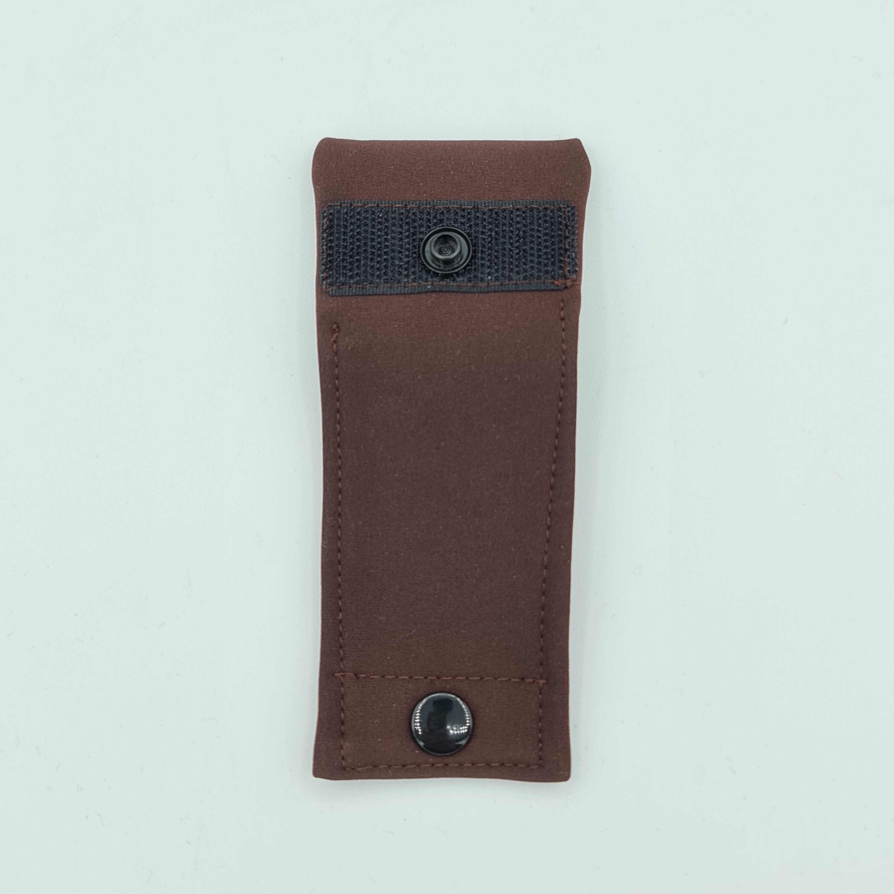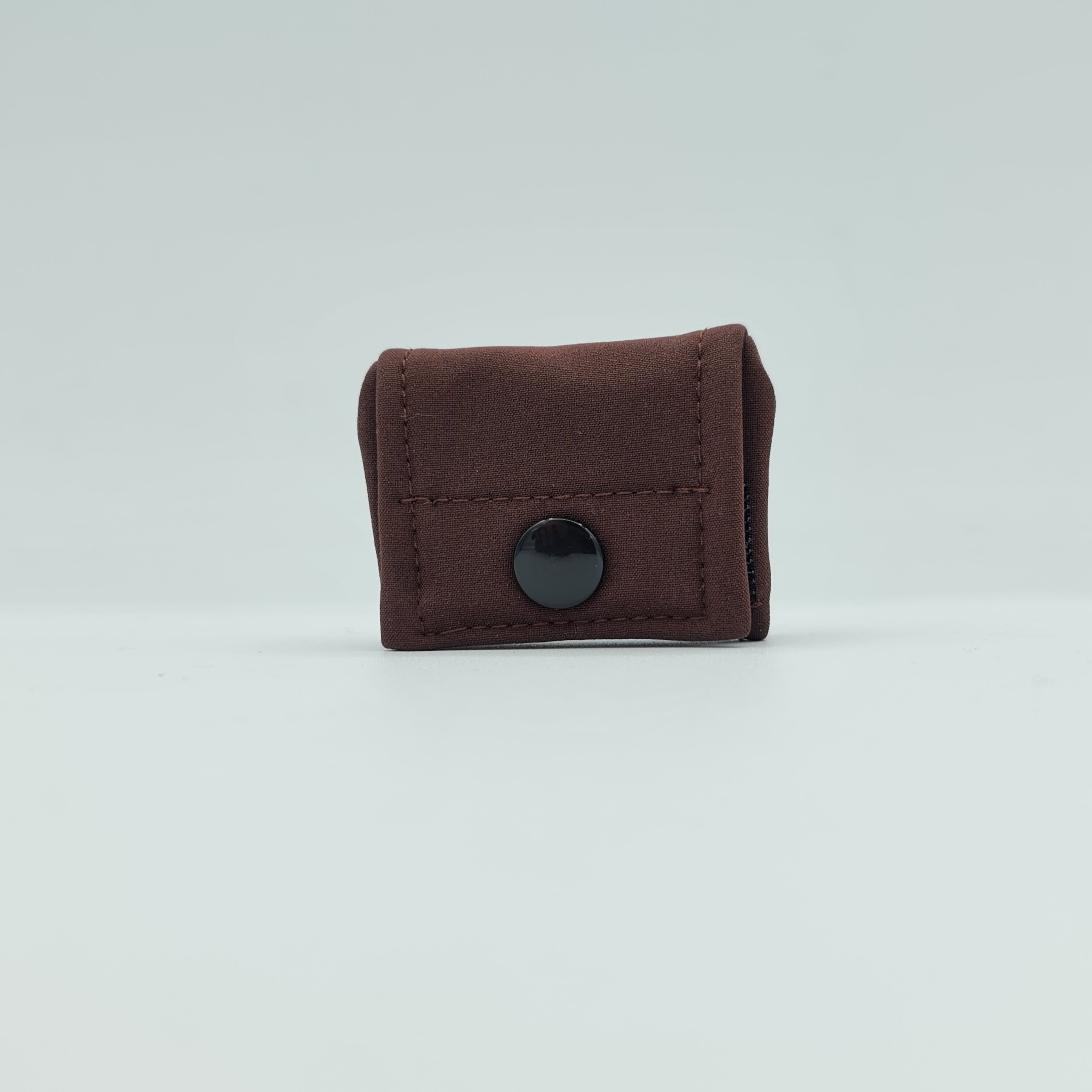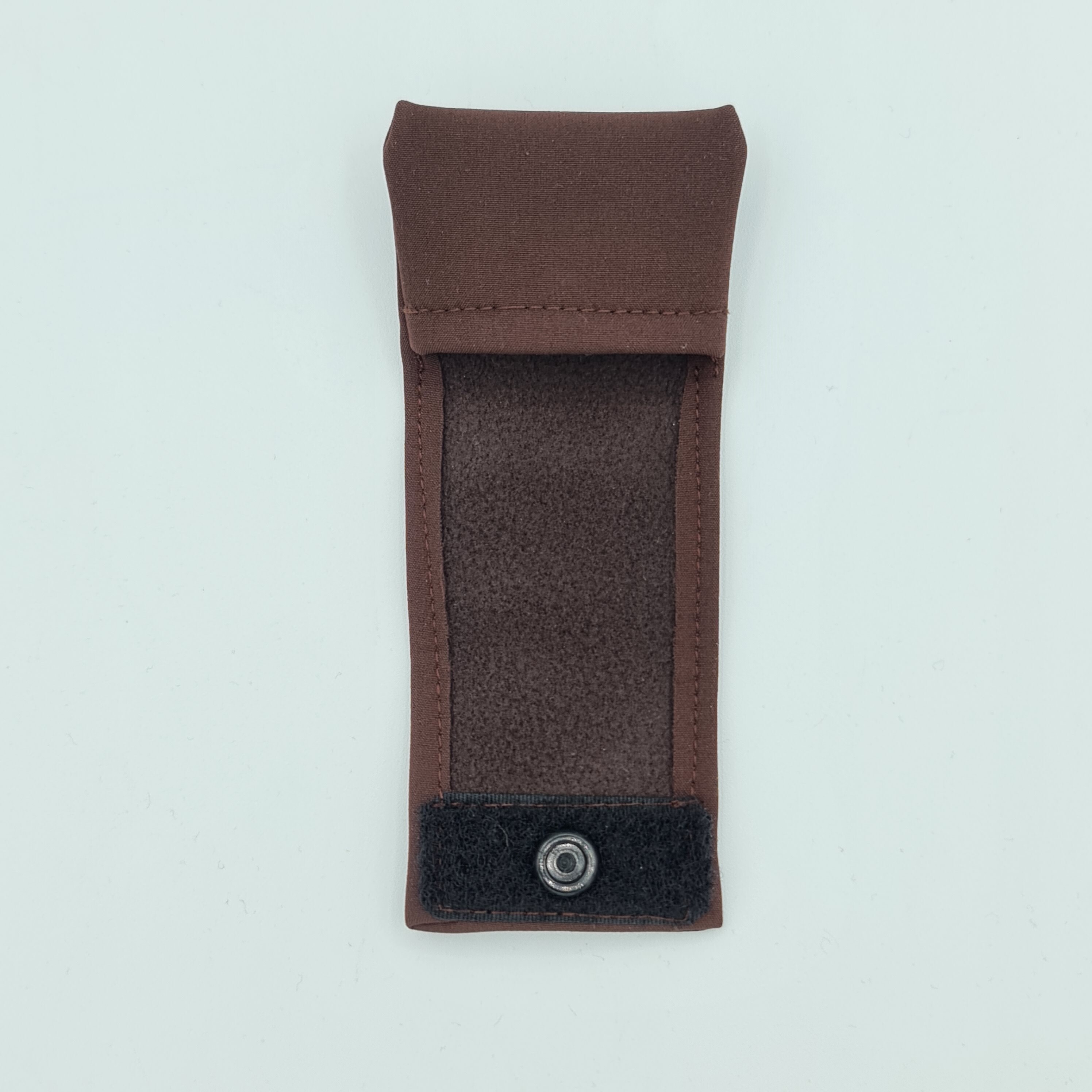 Hier bekommst du einen schokobraunen Markensafe mit schwarzem Klettband und ebenfalls schwarzem Druckknopf.