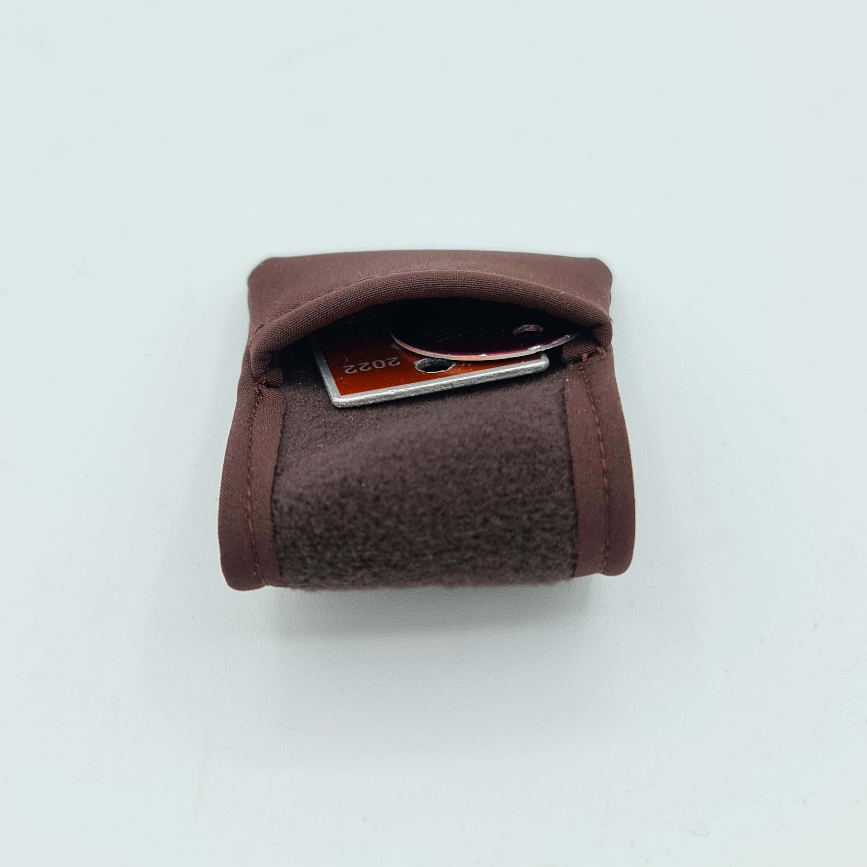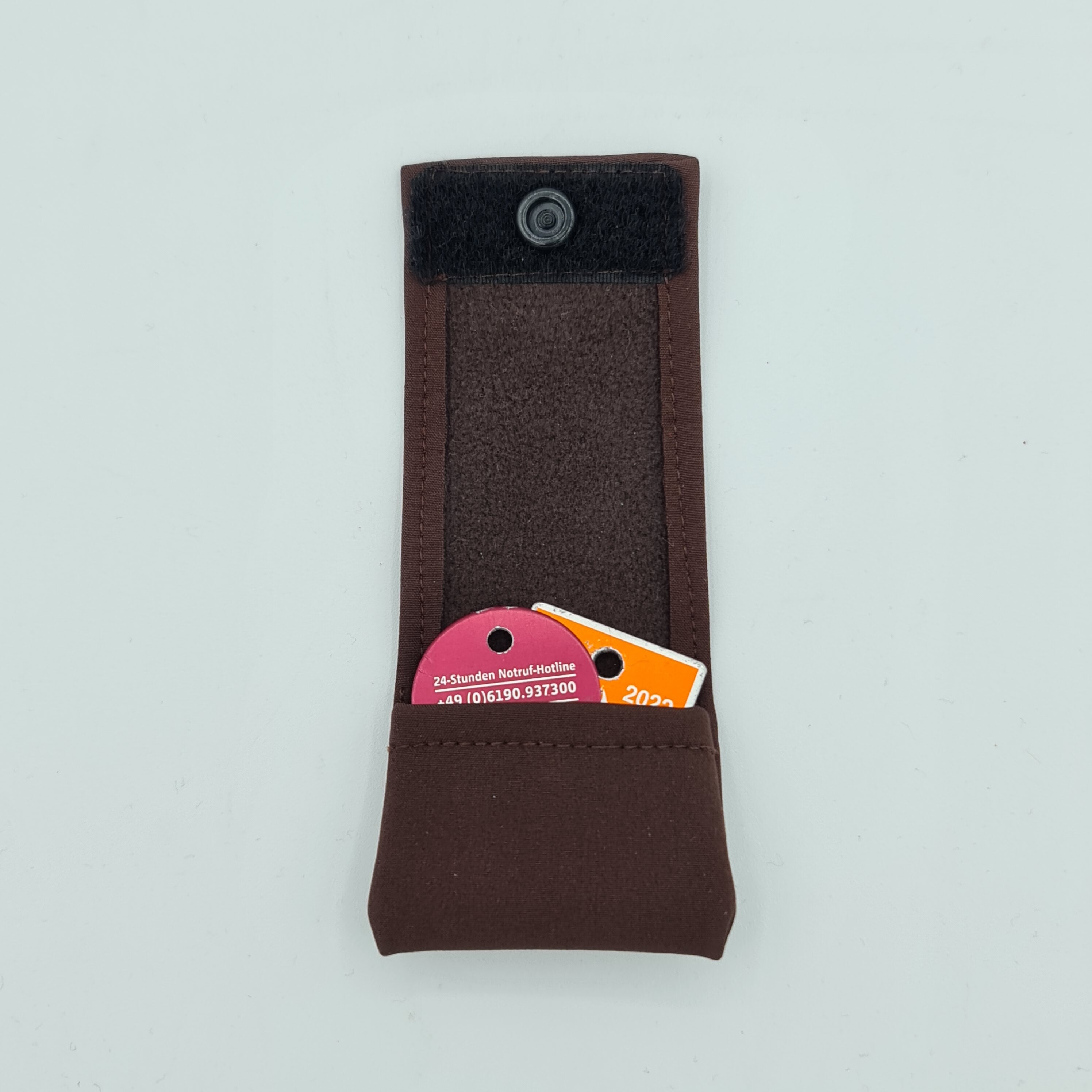 Du steckst die Marke(n) einfach in den Safe, und wickelst diesen um das Geschirr oder Halsband. Er wird sicher, doppelt verschlossen mit Klettverschluss und Druckknopf.