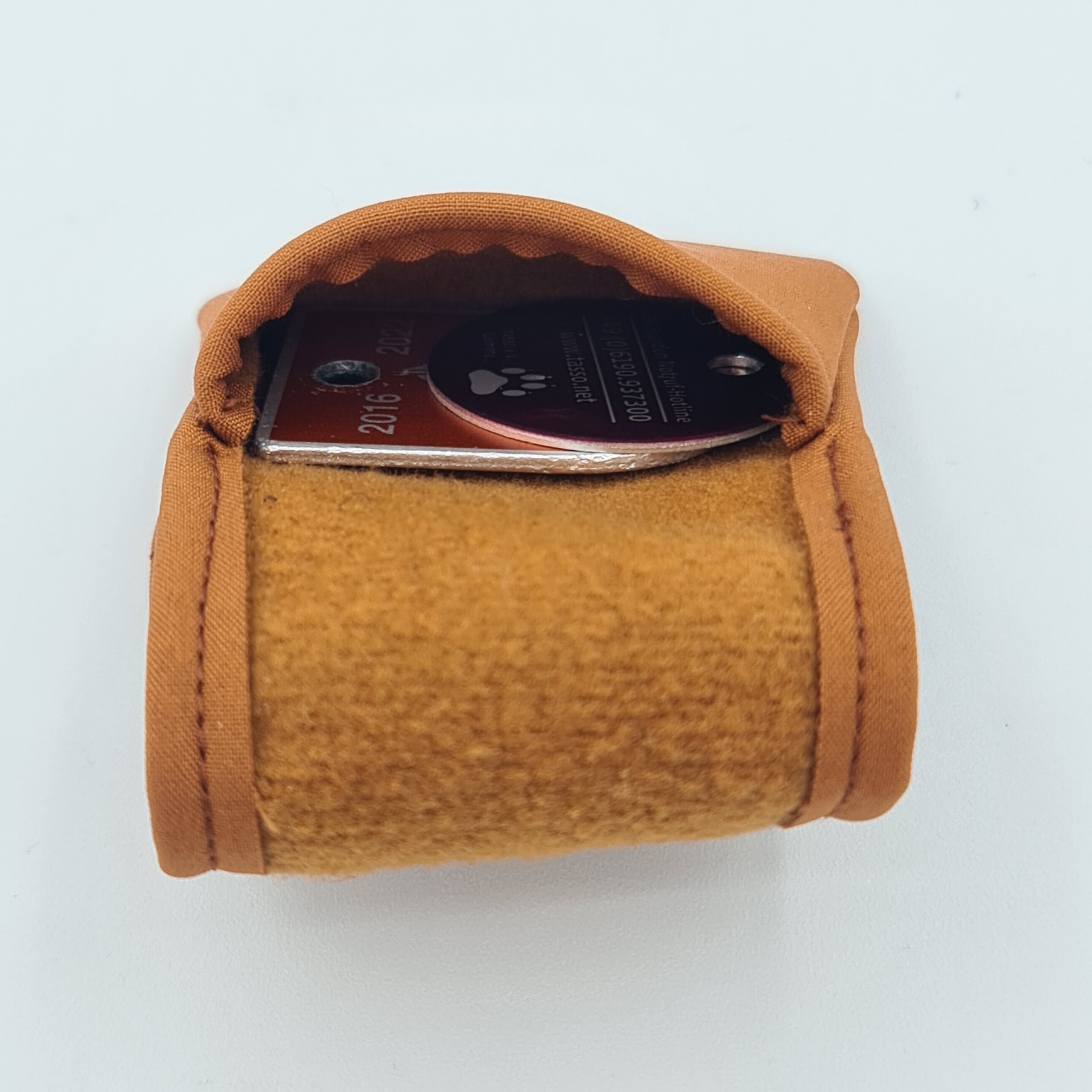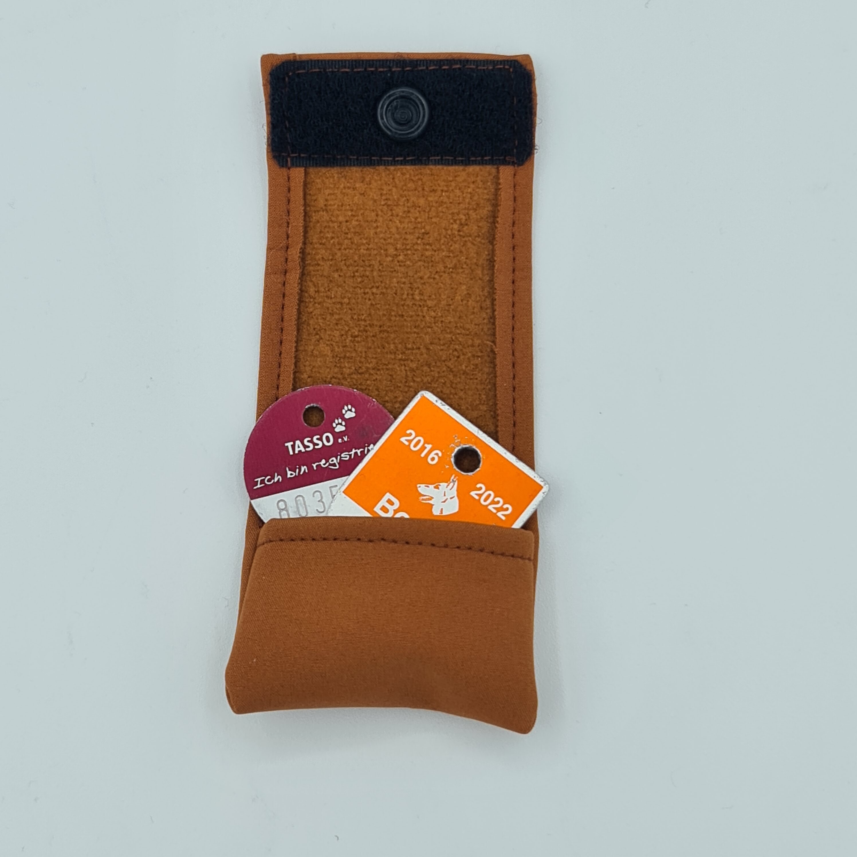 Du steckst die Marke(n) einfach in den Safe, und wickelst diesen um das Geschirr oder Halsband. Er wird sicher, doppelt verschlossen mit Klettverschluss und Druckknopf.