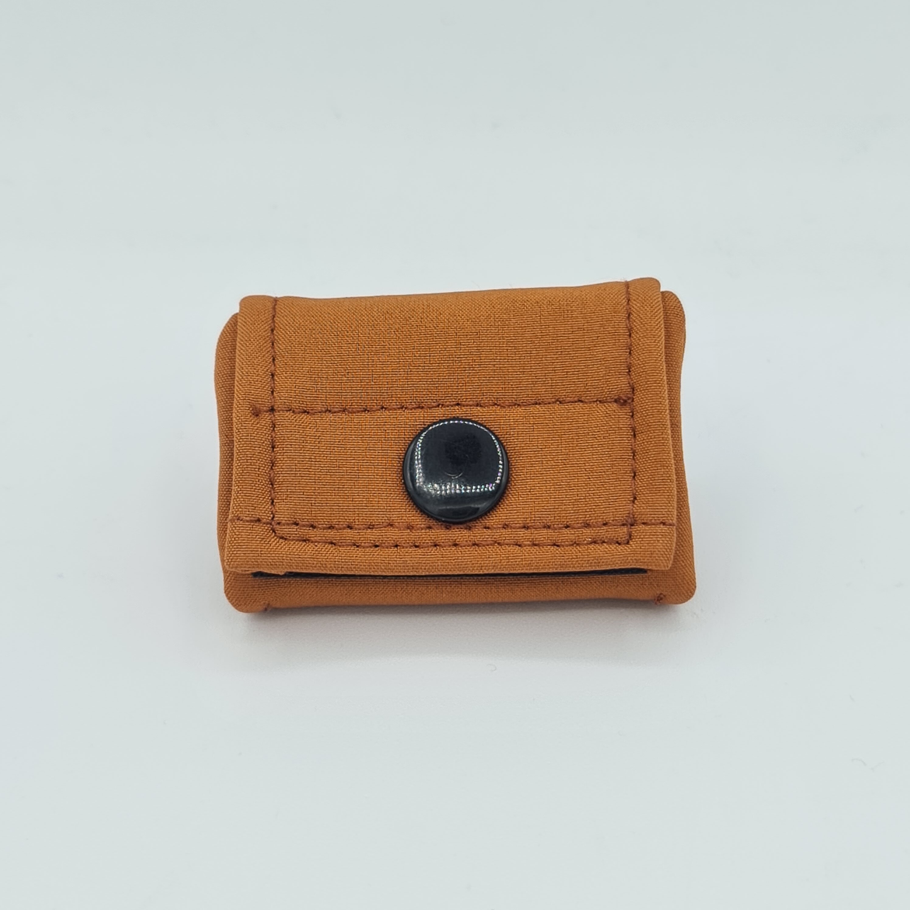 Hier bekommst du einen Markensafe in einem Bronzeton mit schwarzem Klettband und ebenfalls schwarzem Druckknopf.