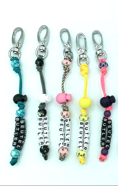 Du kannst den Beutel-Butler natürlich auch selbst gestalten. Die Auswahl der einzelnen Komponenten findest du in den Artikelfotos. Suche dir einfach eine Nylonschnur aus und 3 passende Perlen dazu.