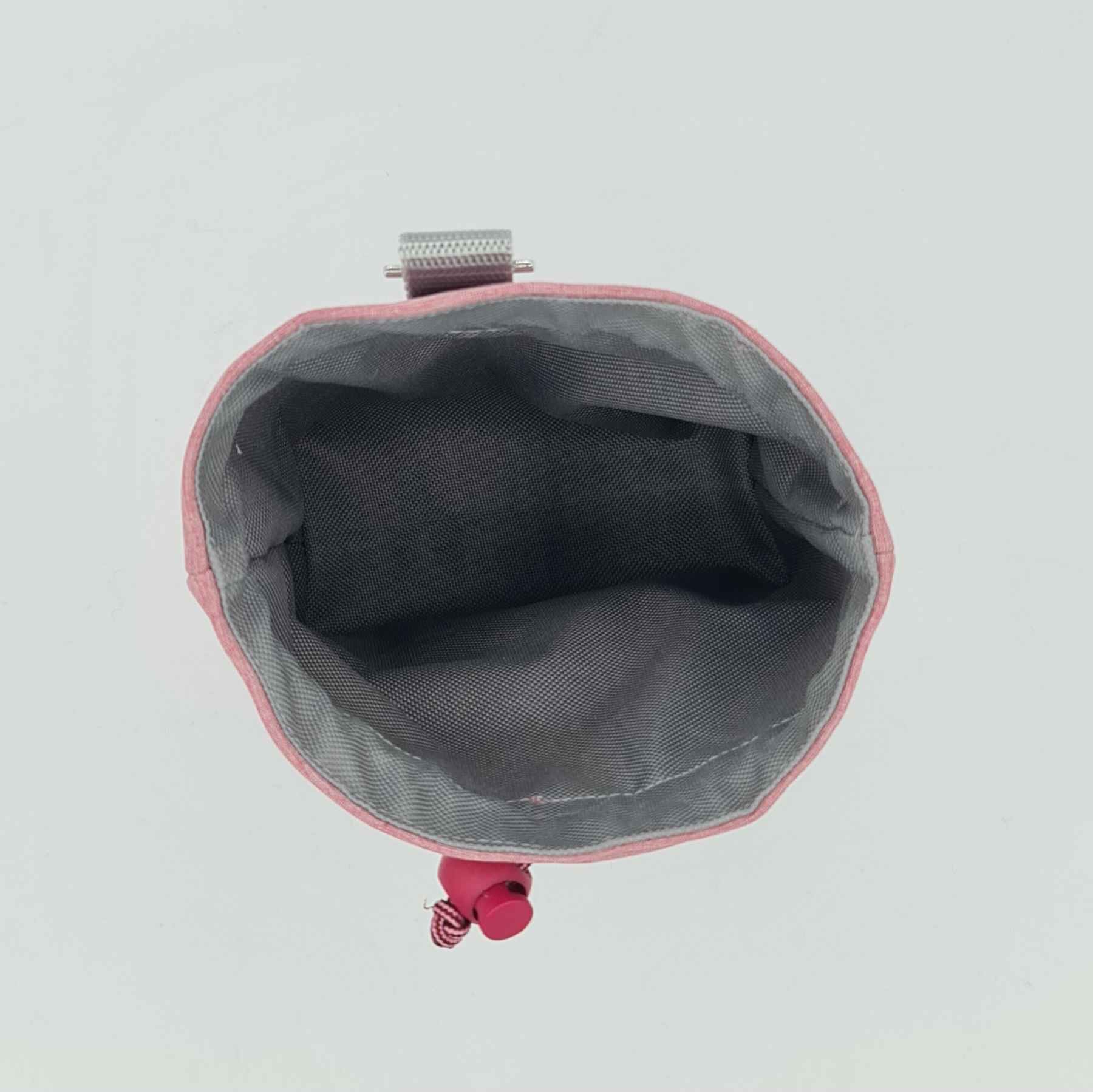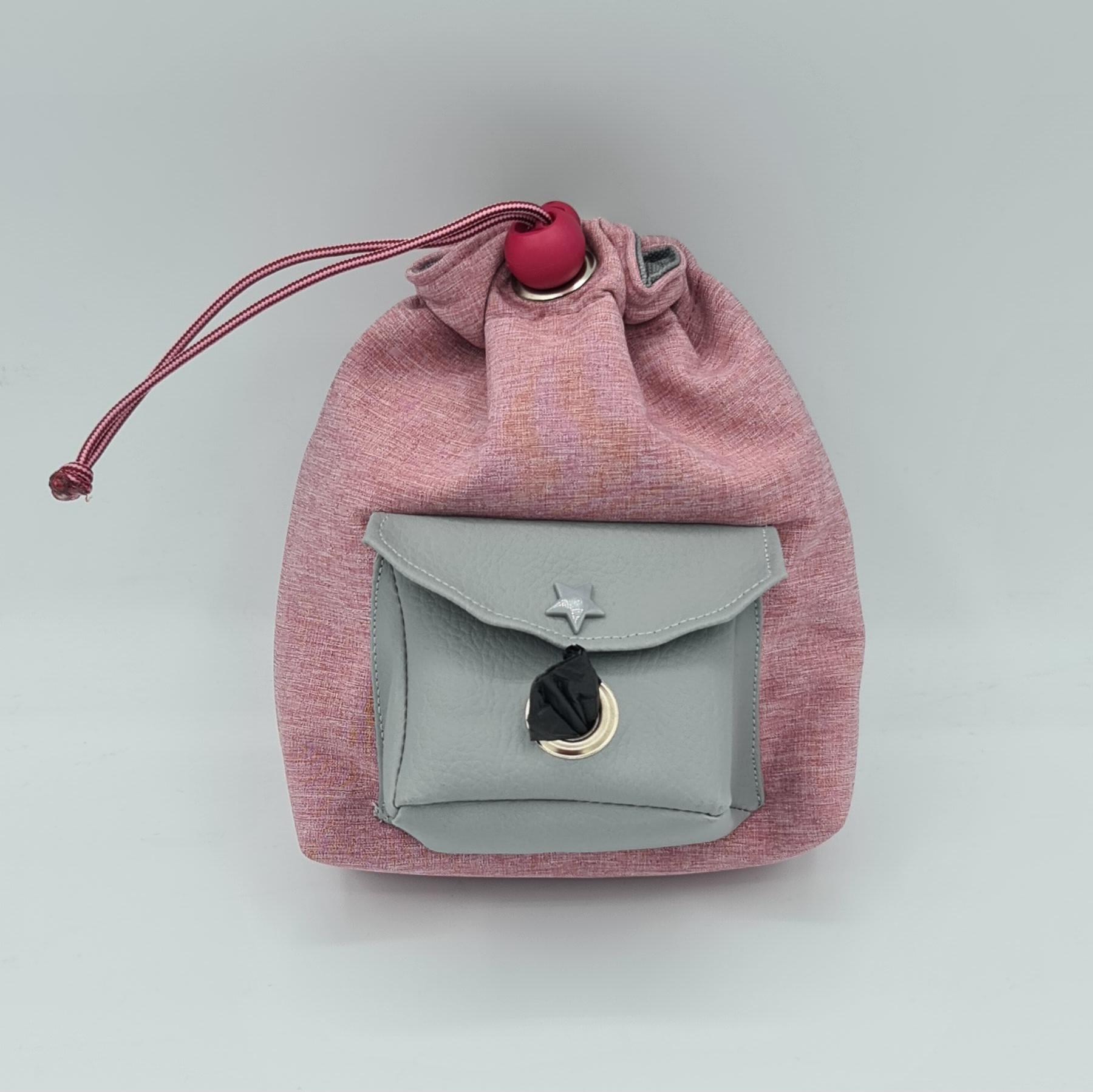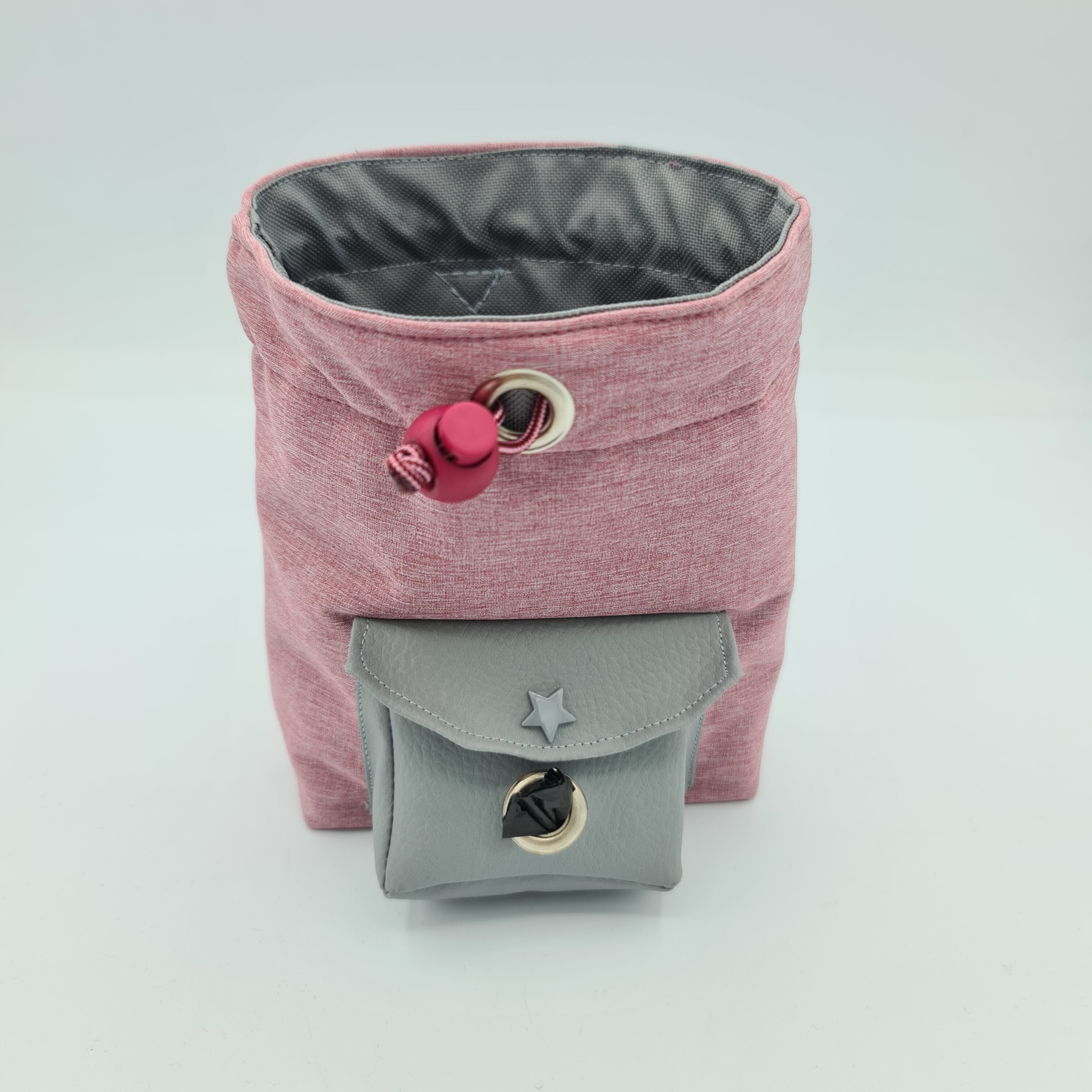 Futterbeutel mit integriertem Kotbeutelspender in Rosarot und Grau