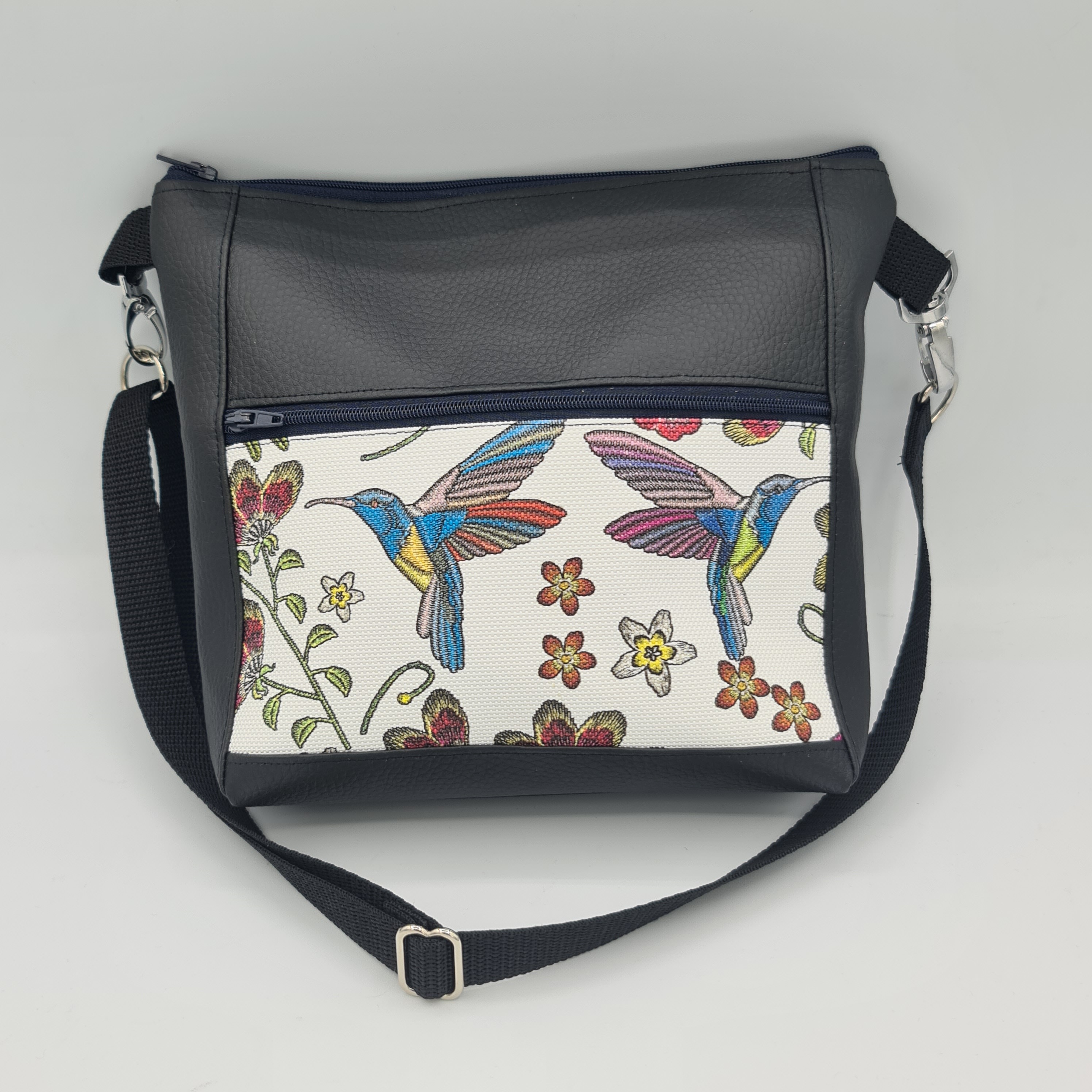 Sie ist außen aus schwarzem Kunstleder gefertigt, so ist sie robust, abwischbar und wasserabweisend. Als Eyecatcher hat sie vorne bunte Kolobris auf weißem Hunterdrund.
