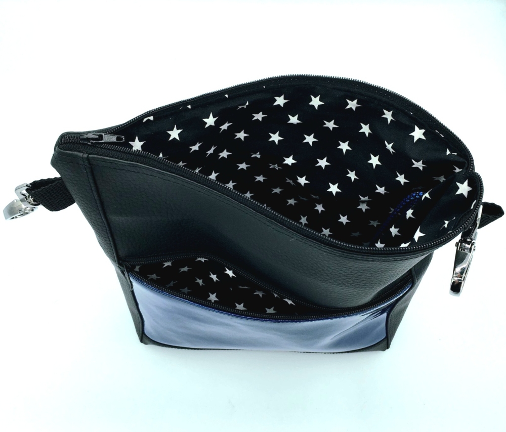 Sie ist außen aus Kunstleder gefertigt, so ist sie robust, abwischbar und wasserabweisend. Der blaue Einsatz wirkt fast wie Lack und enthält dezente Glitzerpartikel.
