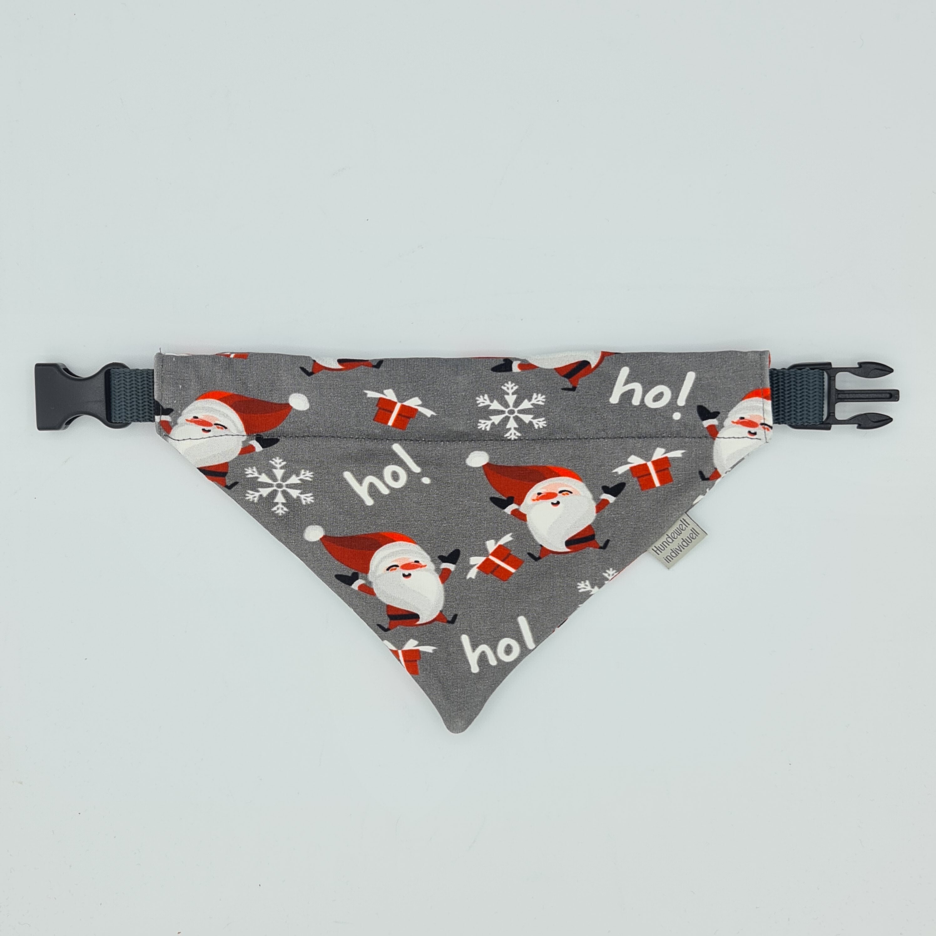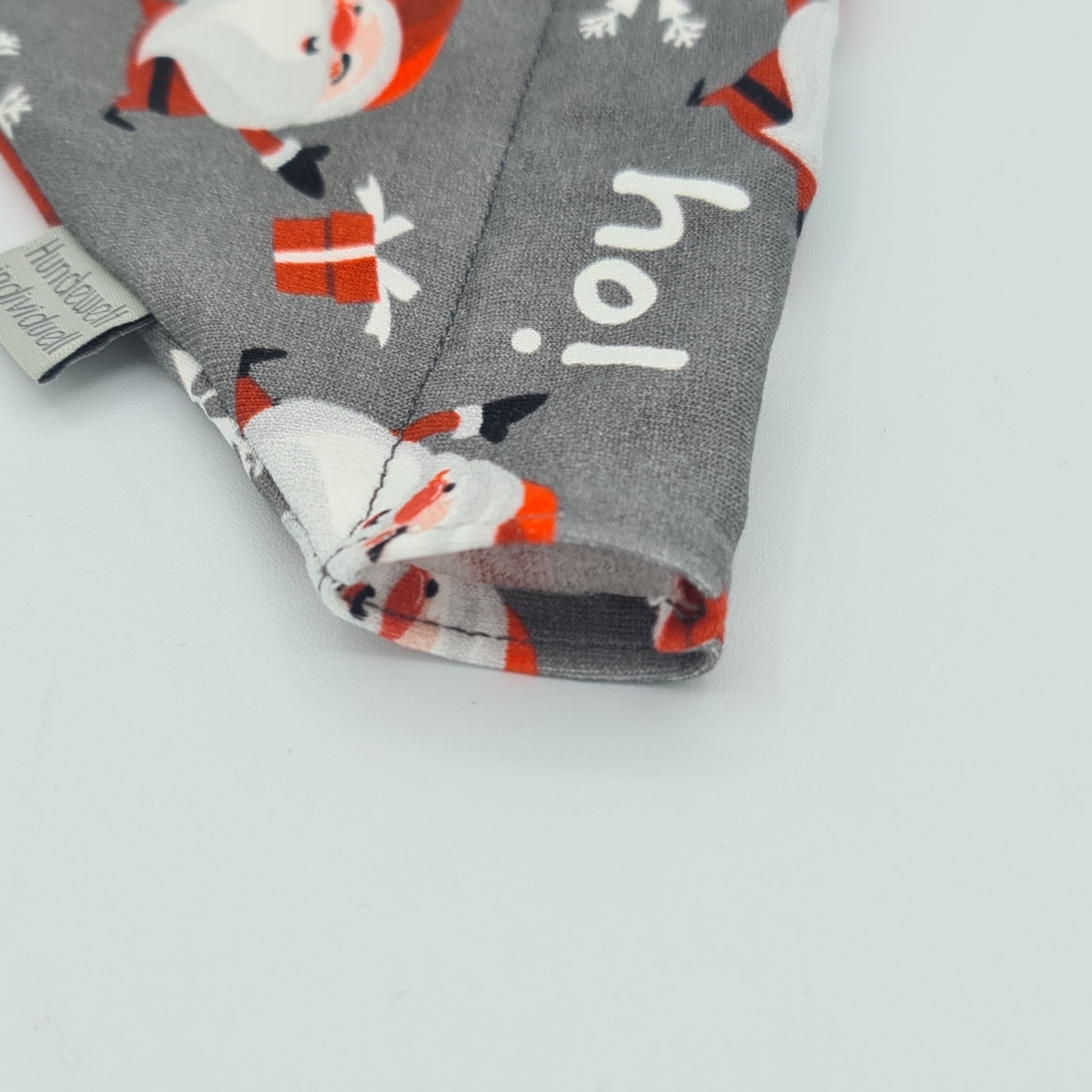 Das Halstuch besteht aus glattem, weichem Baumwolljersey und kann bei 30 Grad in der Maschine gewaschen werden. Es ist idunkelgrau und hat niedliche Weihnachtsmänner in rot drauf