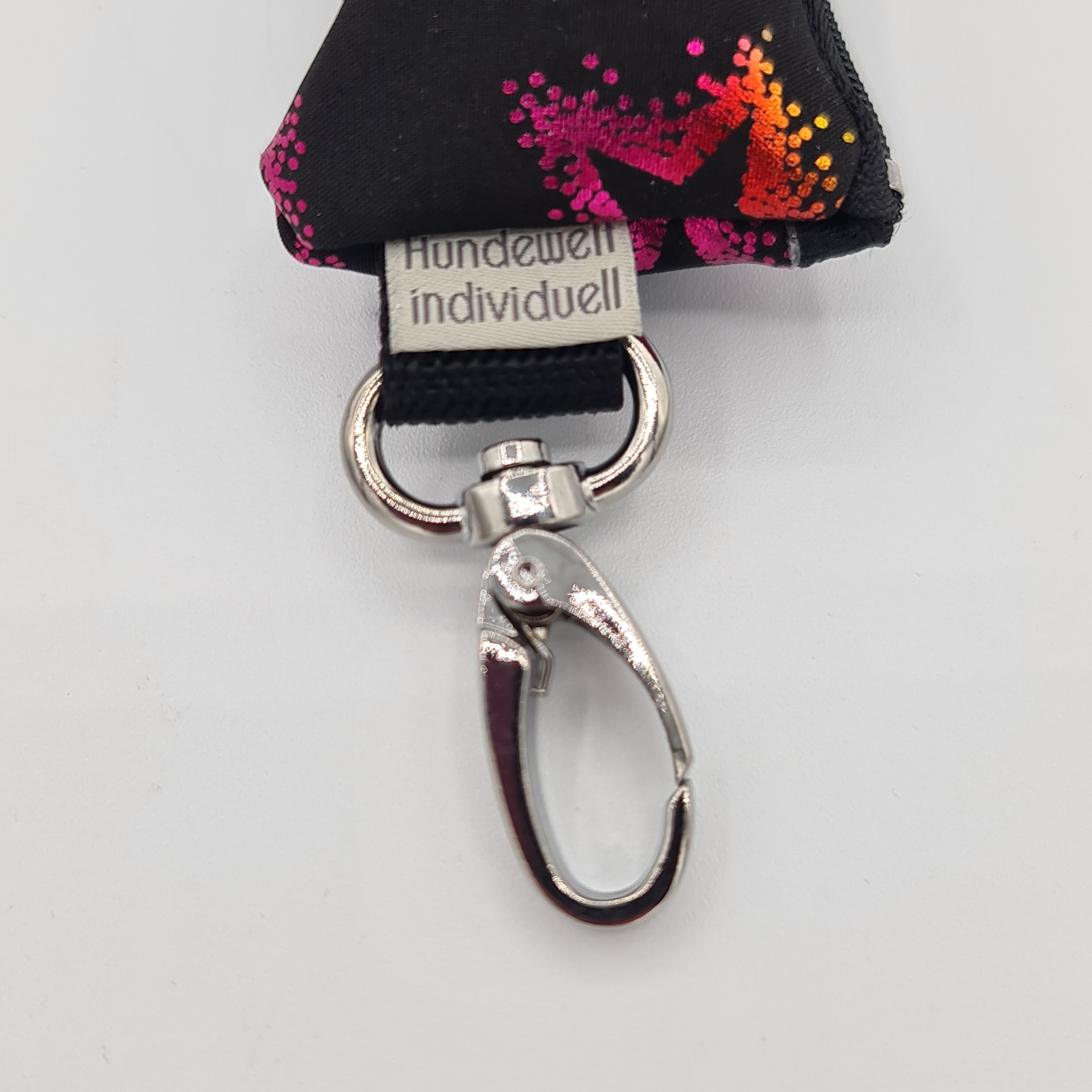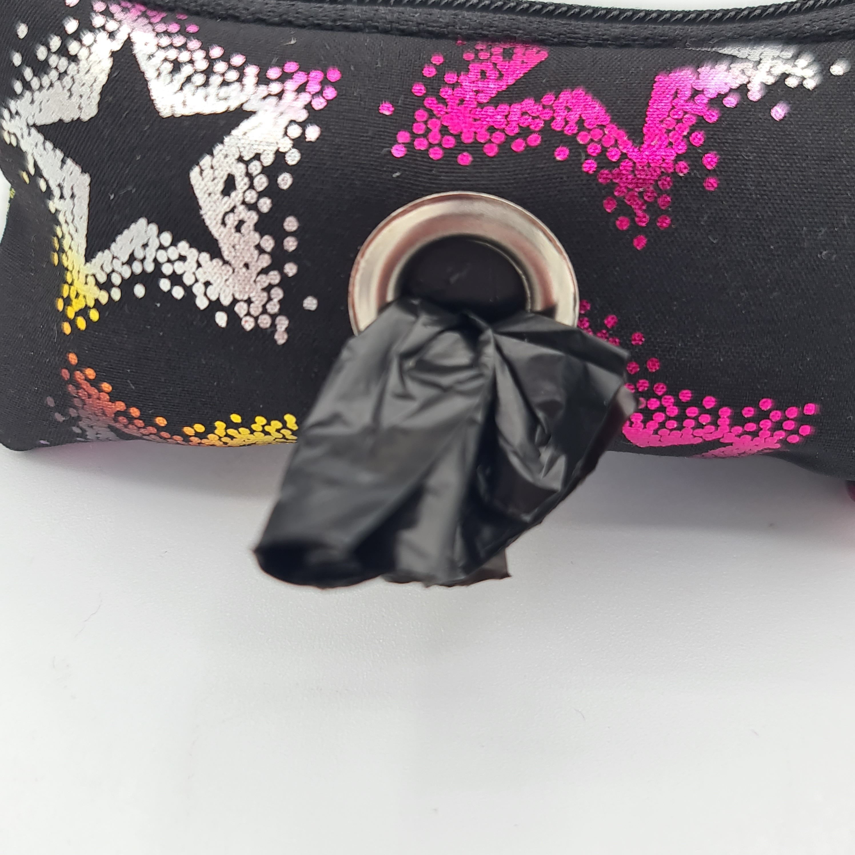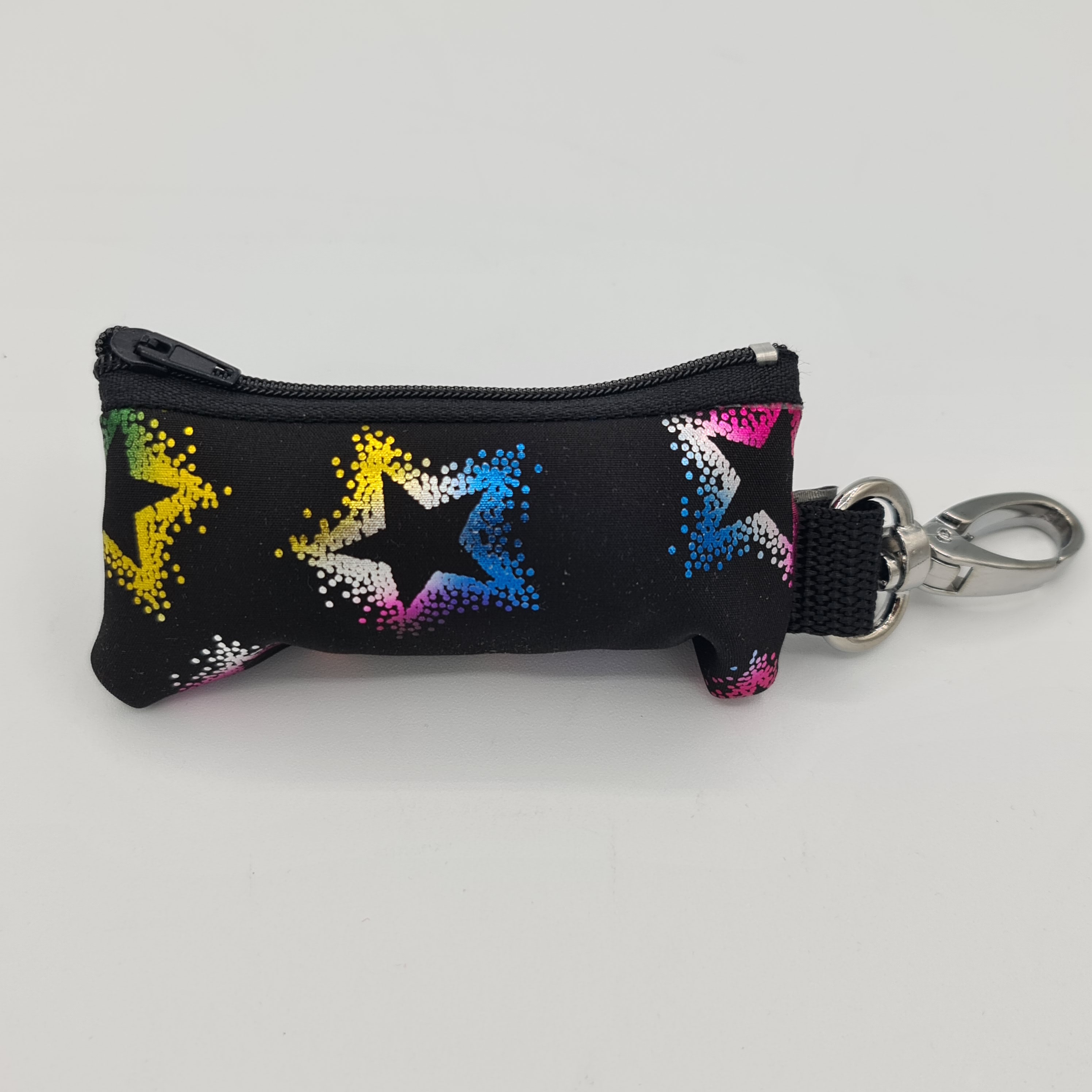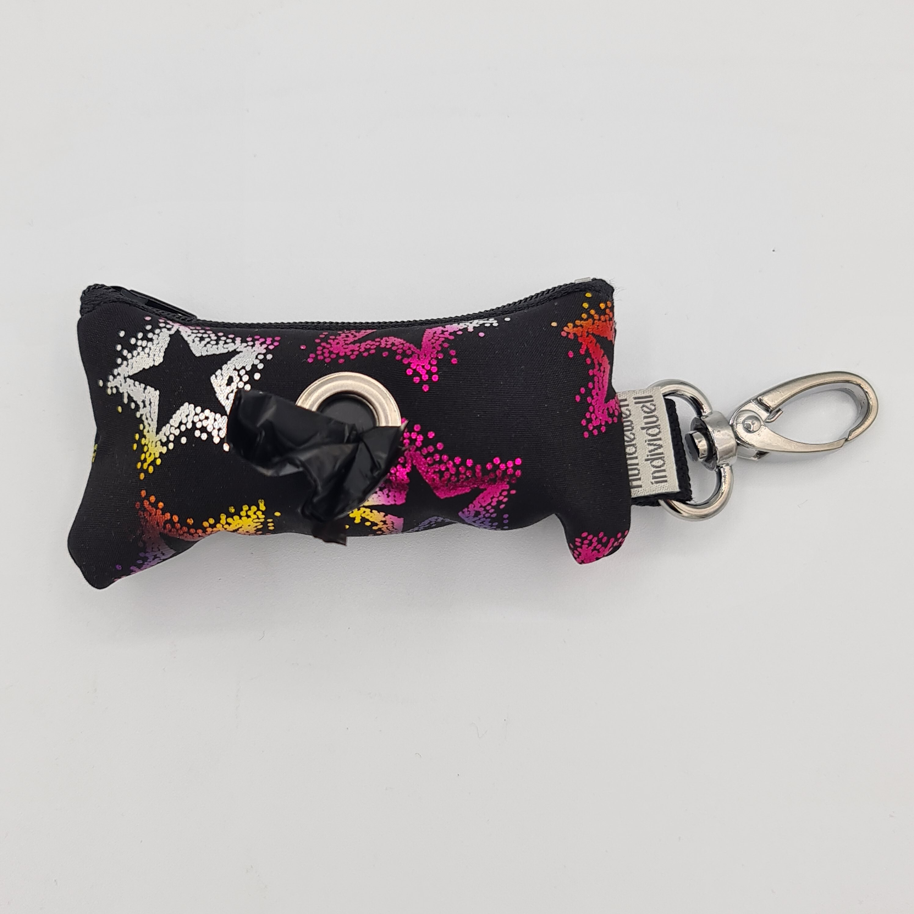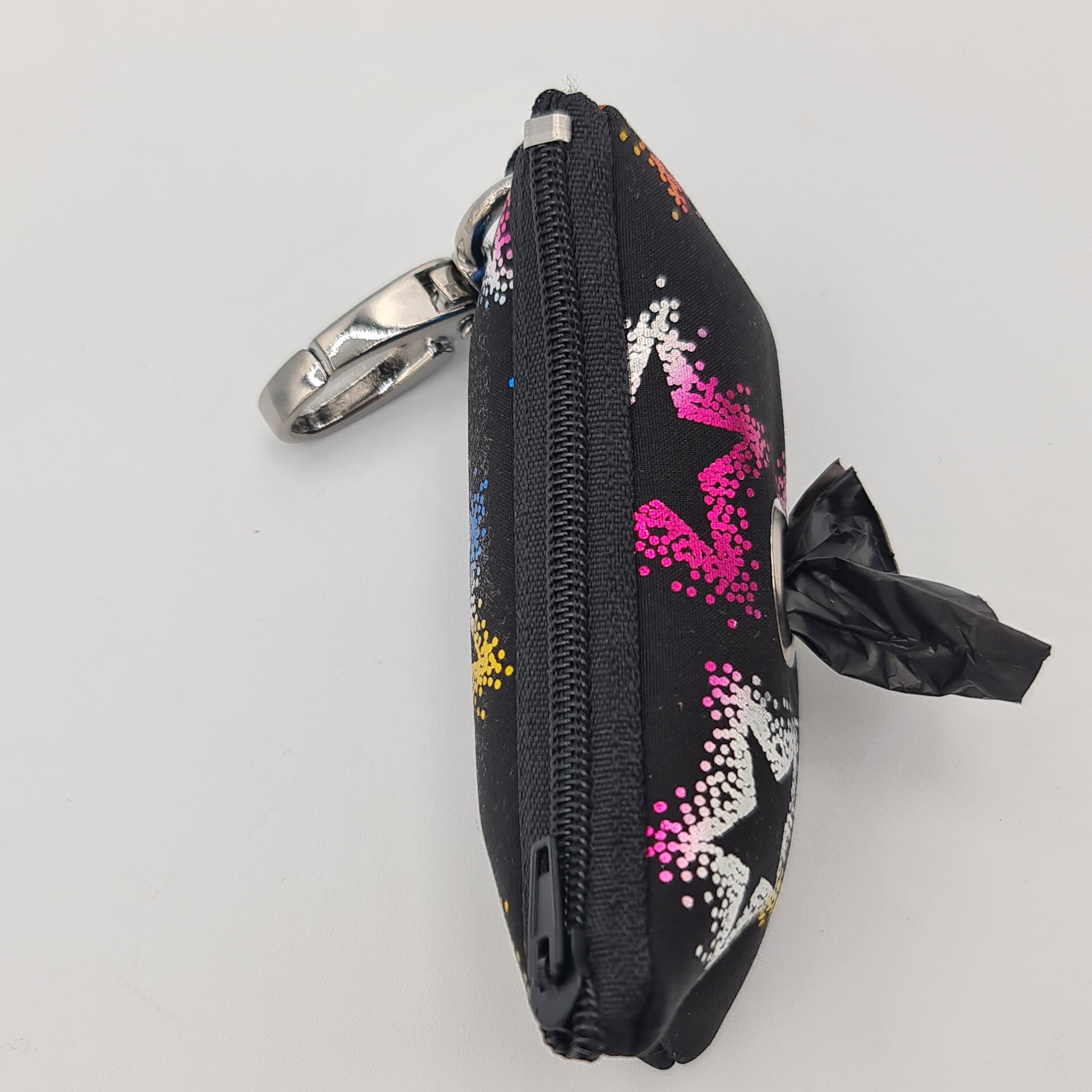 Der Kotbeutelspender ist schwarz mit metallisch, bunten Sternen und kommt mit passendem, schwarzem Reißverschluss.