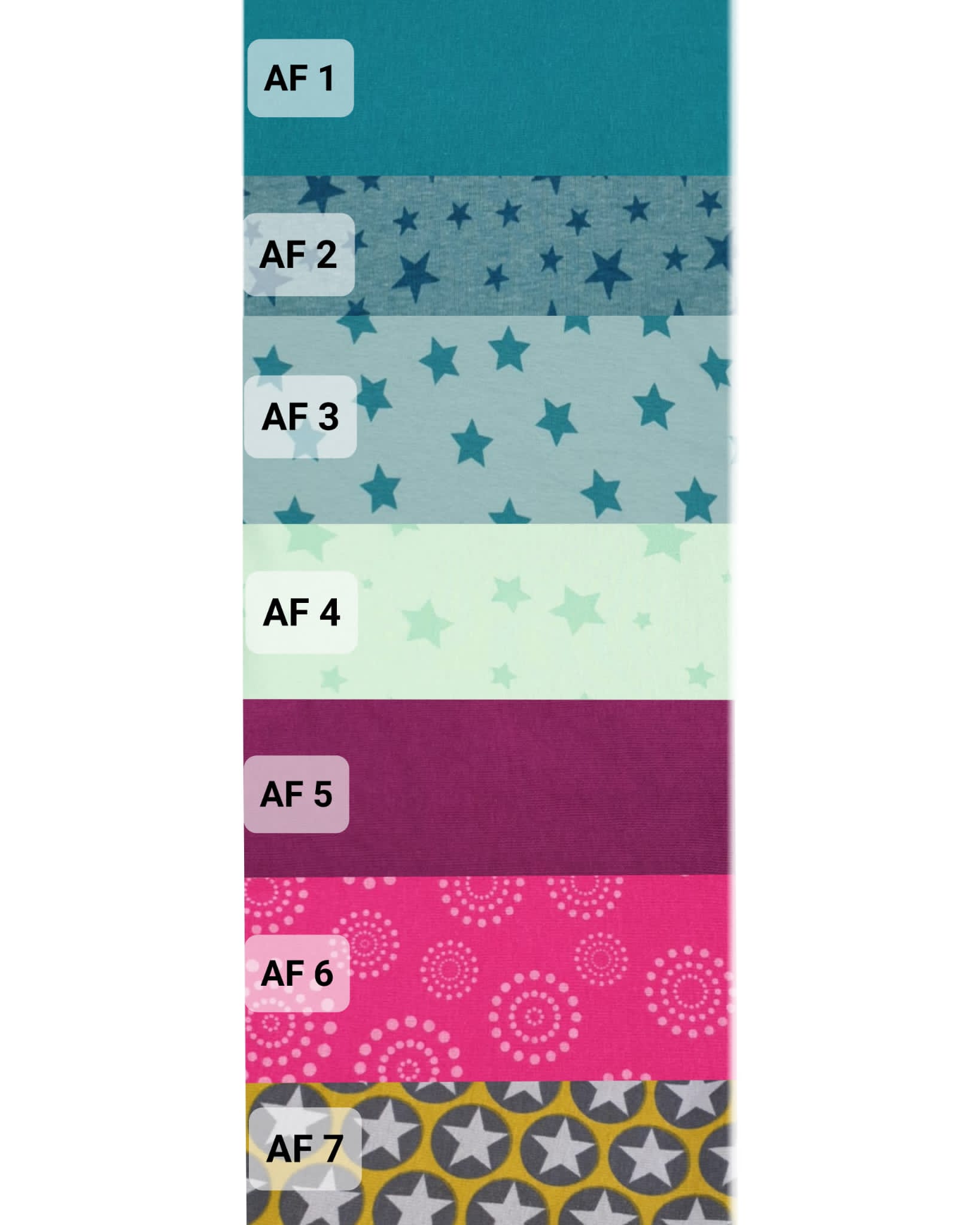 Der Loop kann recht dünn aus Jersey genäht werden, das sind die J-Stoffe, oder aus warmem Alpenfleece, das sind die AF-Stoffe.