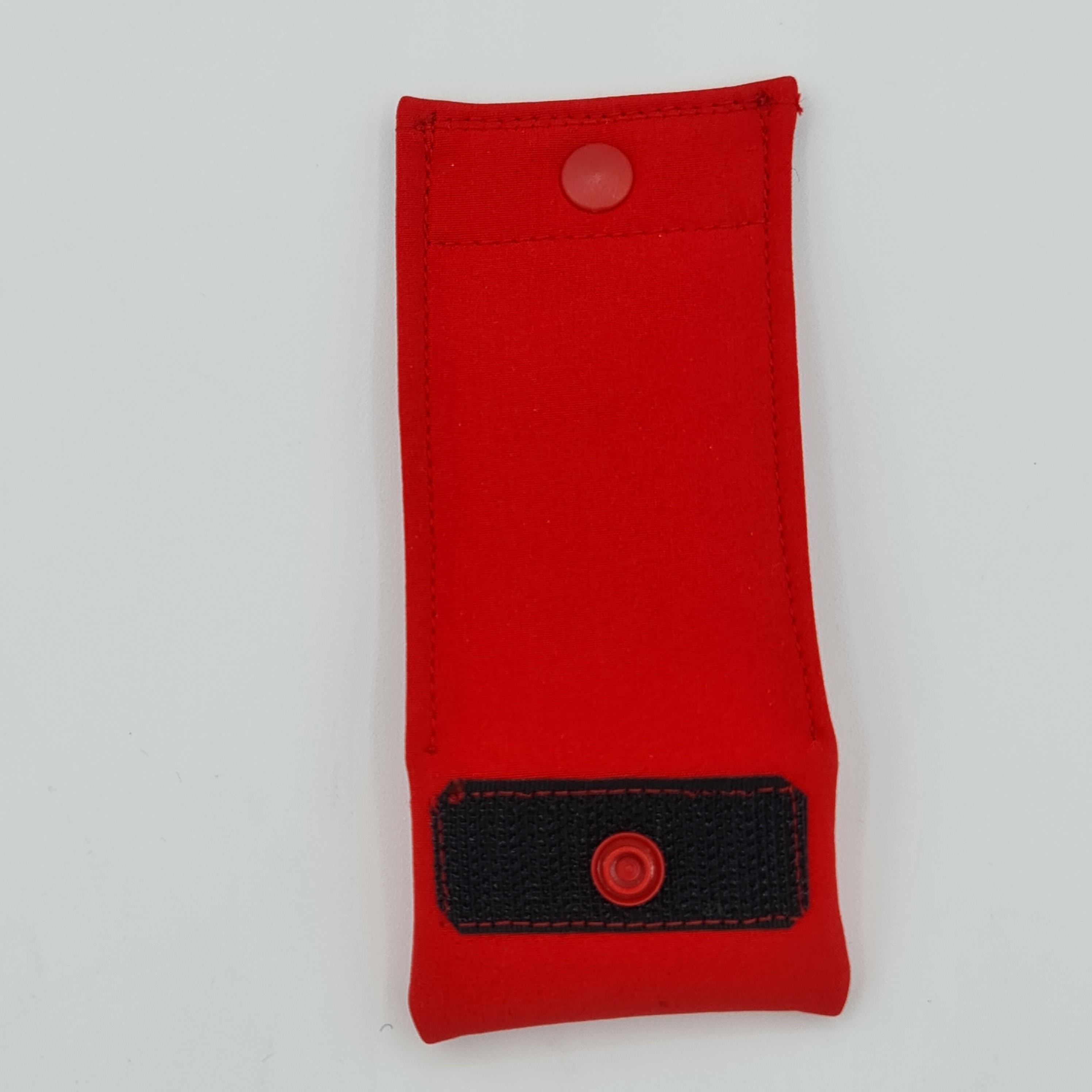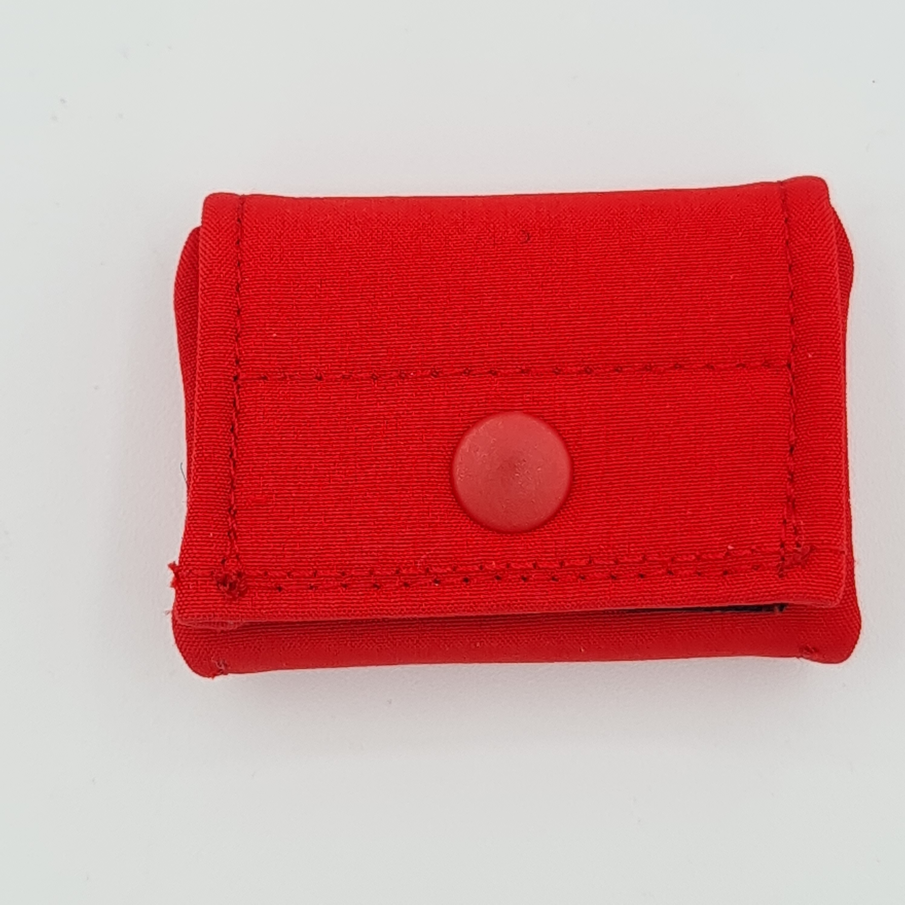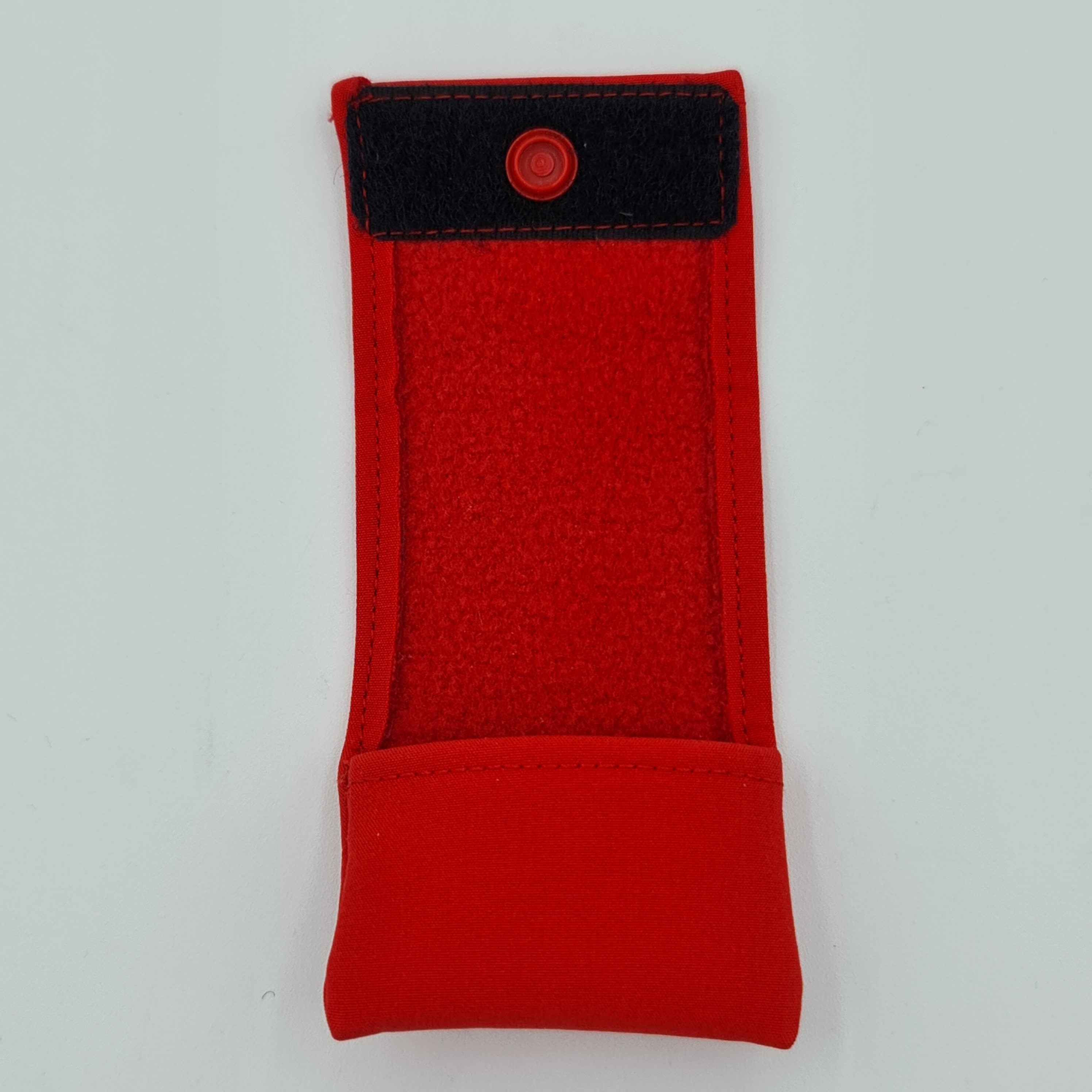 Hier bekommst du einen roten Markensafe, mit schwarzem Klettband undrotem Druckknopf.